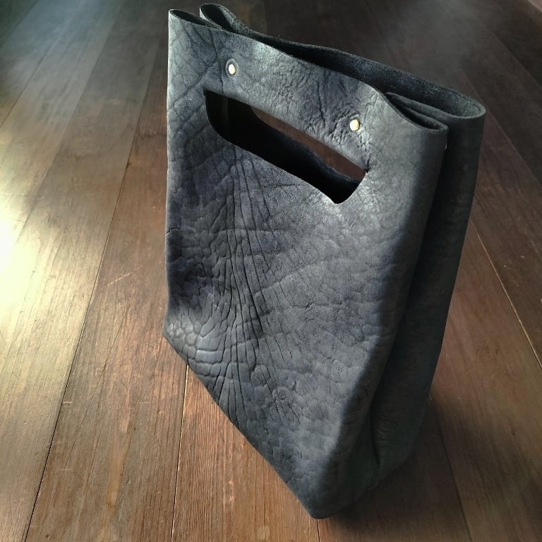 イタリア・トスカーナのタンナーでミニマムロットで受注生産したホースクラッタの吟面層(ヌバック調)をアッパーに使いマルシェバッグを作りました。