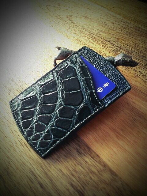 ネイビーのクロコダイルのハギレでパスケースを作りました。