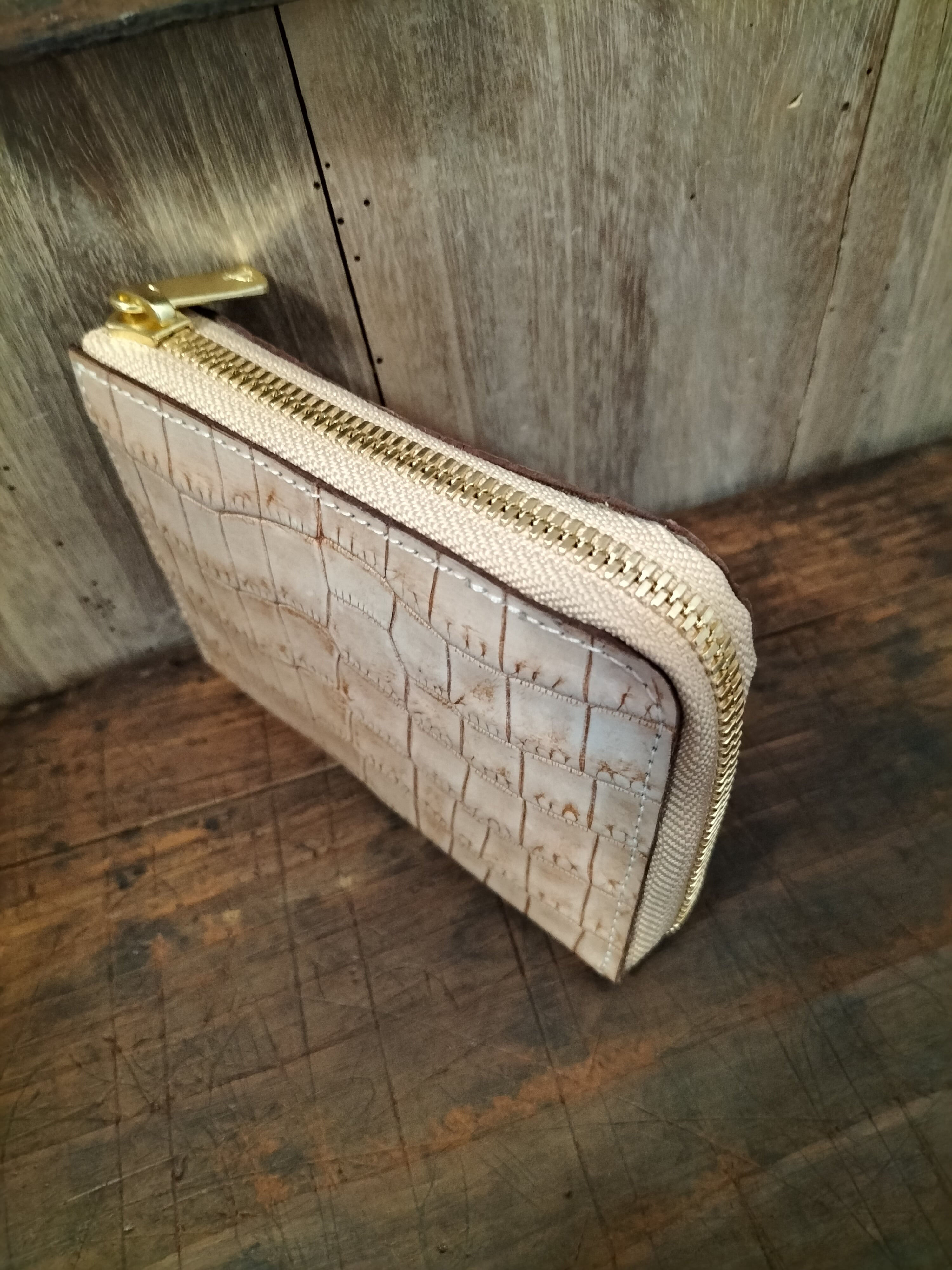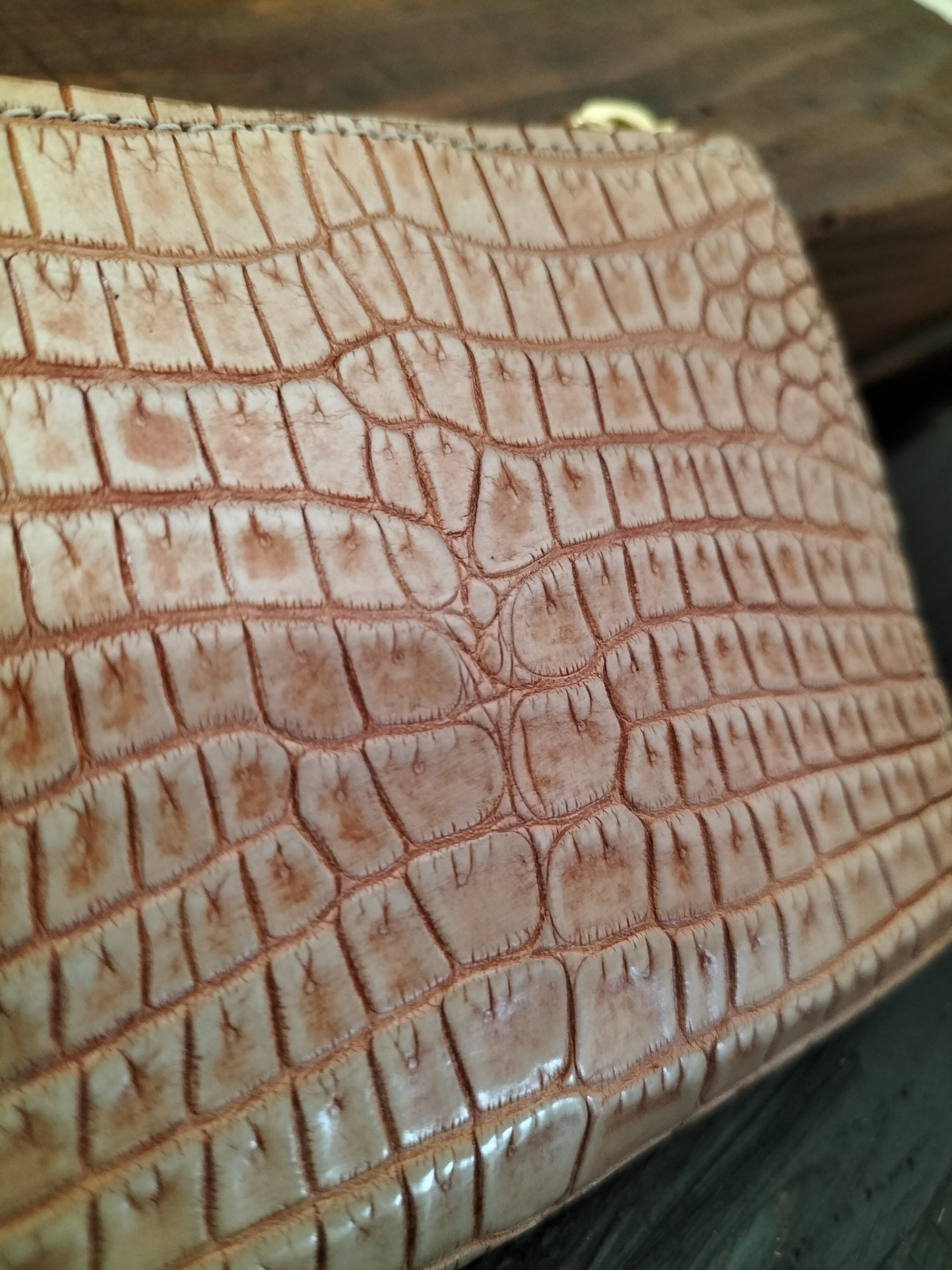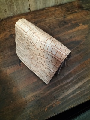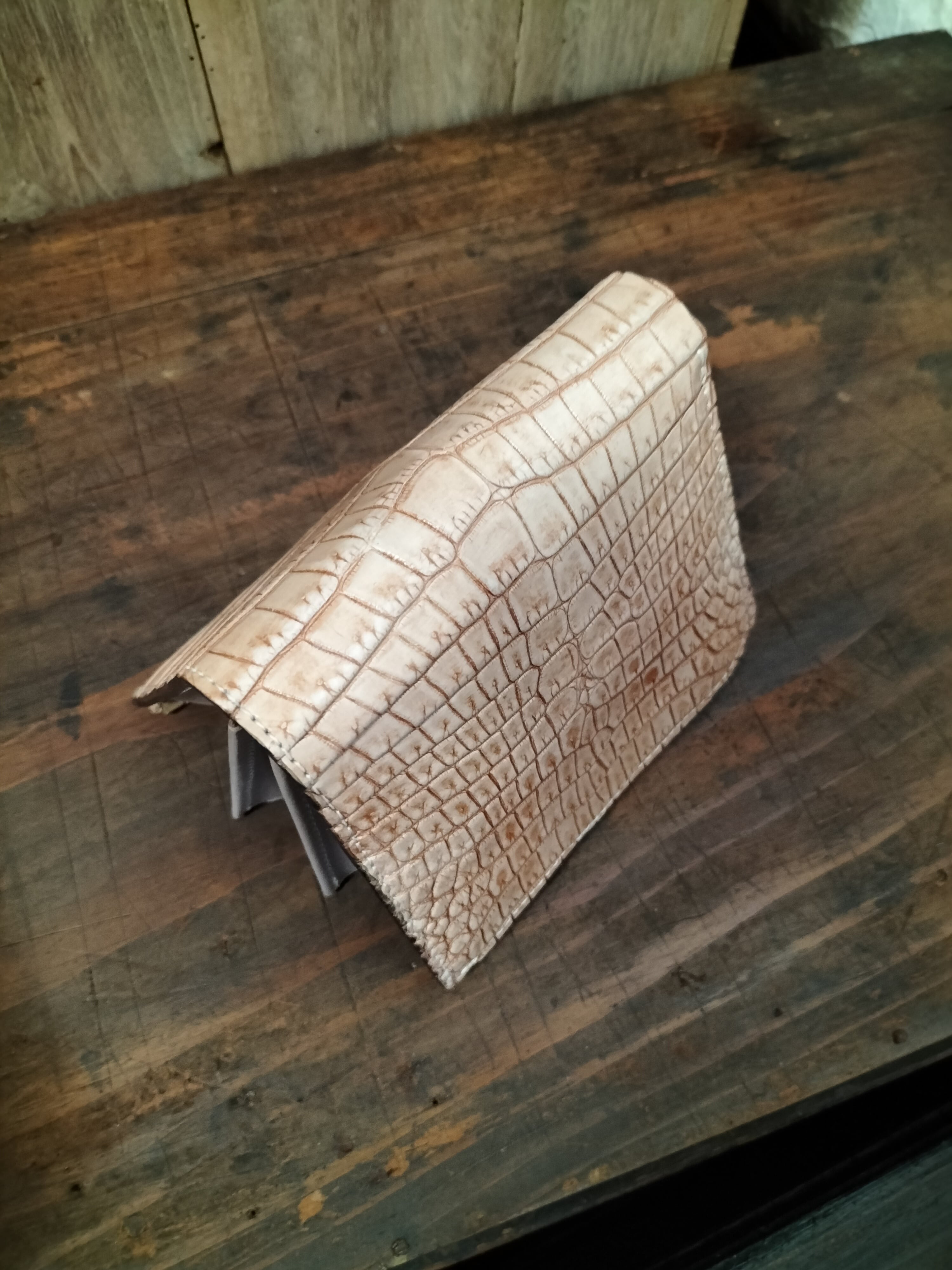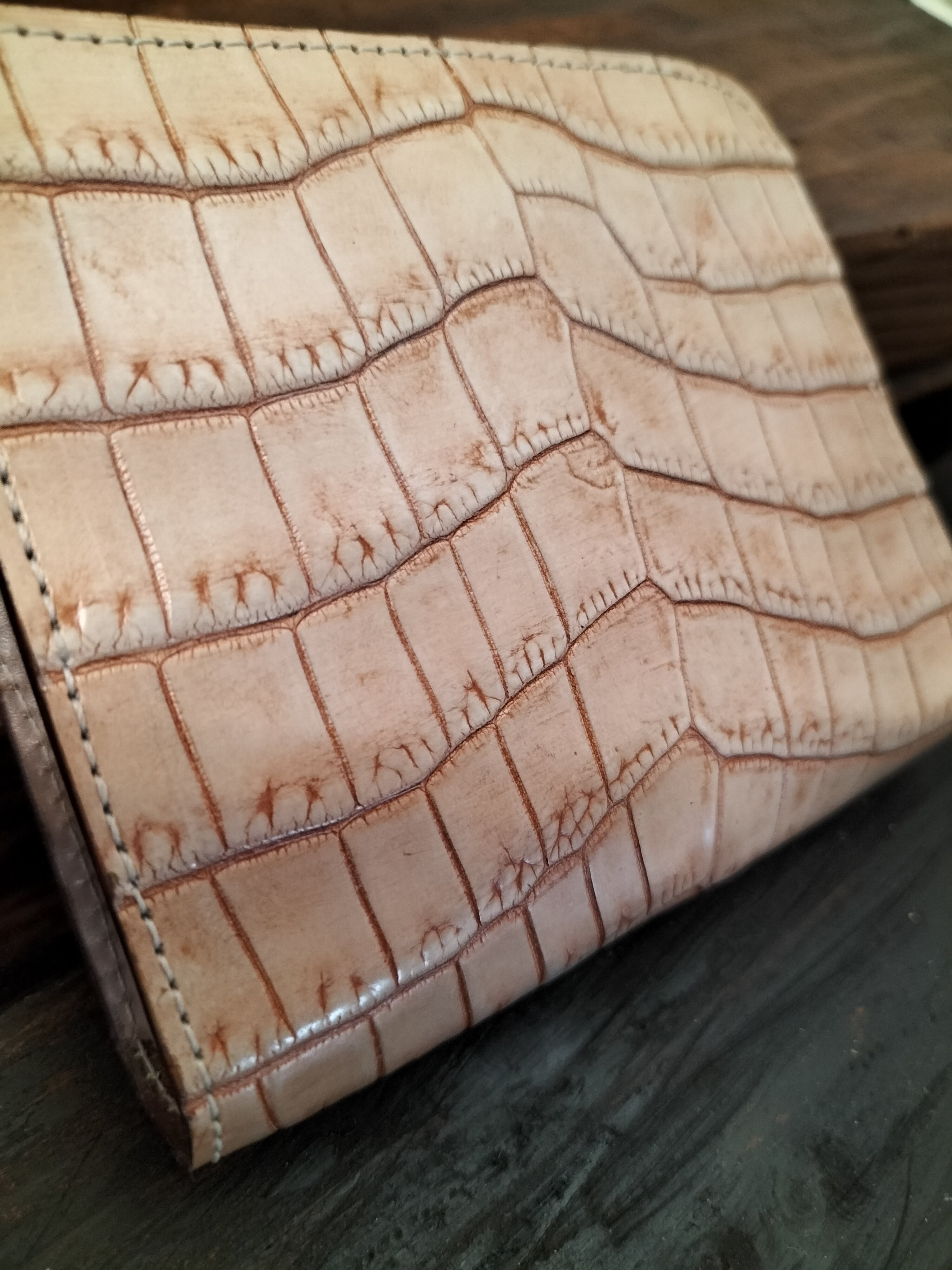 型押しでは無い、本物のナイルクロコダイルのベリーの部分を使用し、クラストのクロコダイルに柿渋を塗り込み磨き上げたオリジナルな仕上げをしてあります。