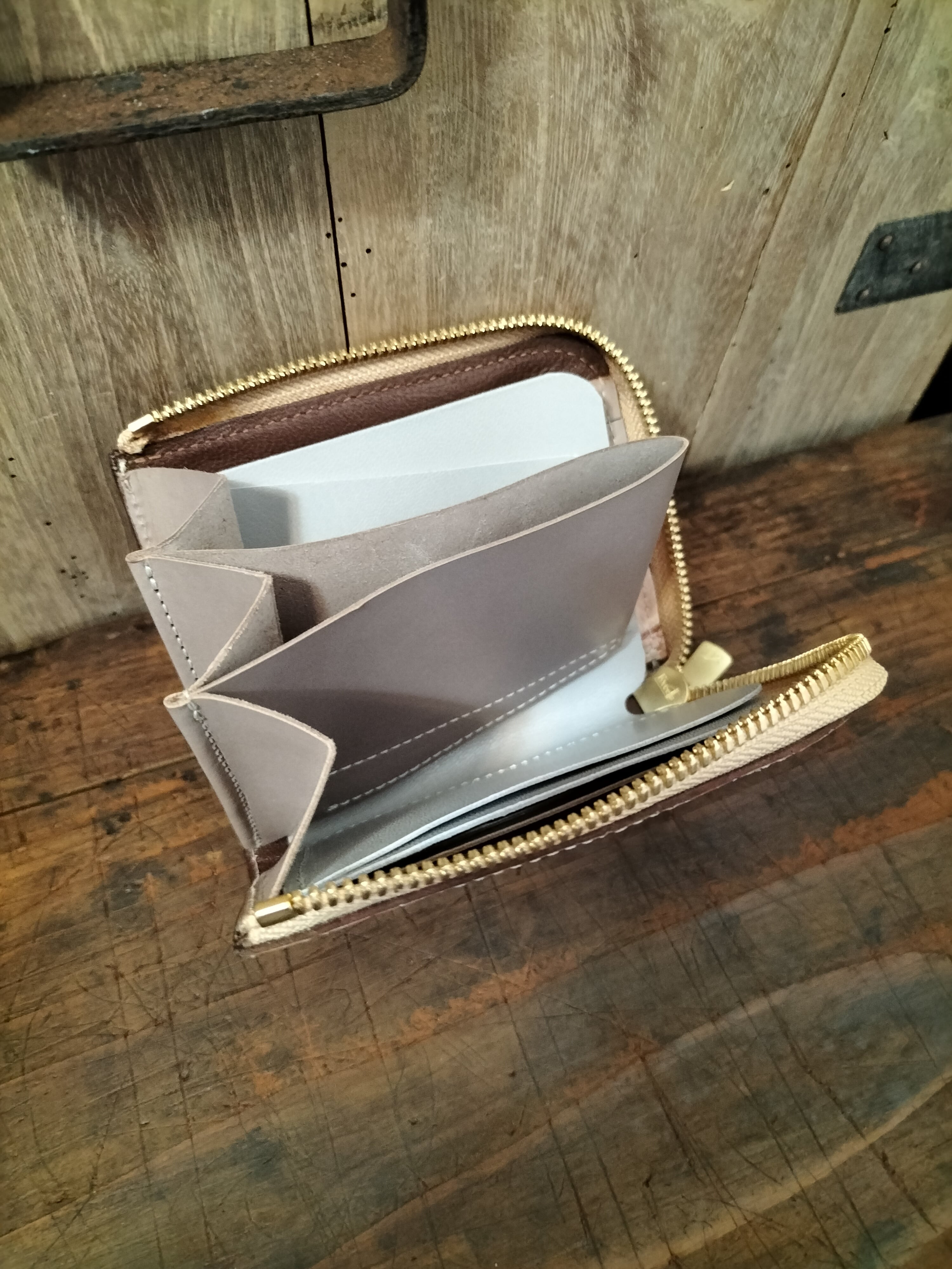 未染色のクロコを仕入れて自分で柿渋染めを施し磨き上げています。